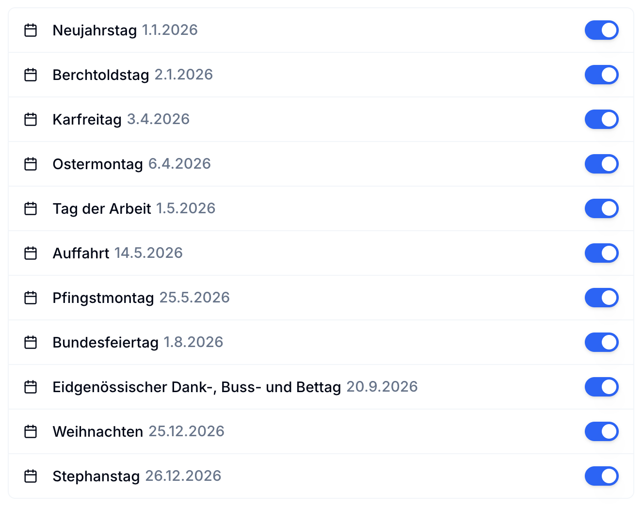 Zentraler Import der Schweizer Feiertage